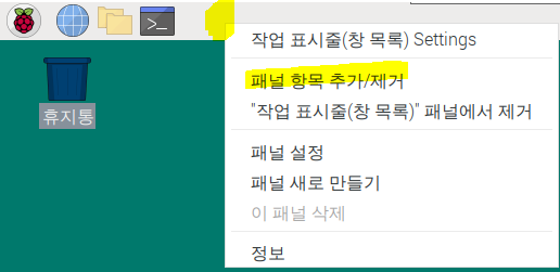 먼저 라즈베리파이 OS 패널에서 마우스 우클릭 후 "패널 항목 추가/제거"를 선택해 줍니다.