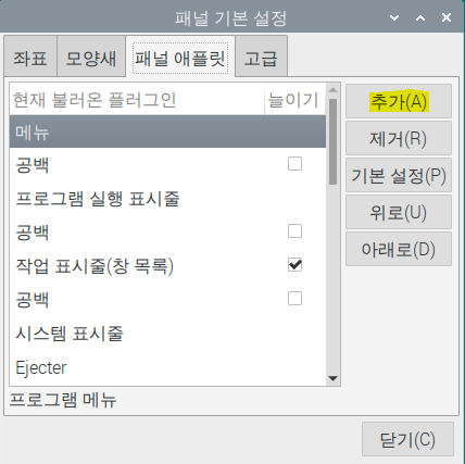 패널 애플릿 탭에서 추가 버튼을 눌러 줍니다.