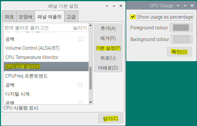 패널 애필릿 탭에서 CPU 사용 감시기를 선택 후 기본설정(P)를 클릭 합니다.