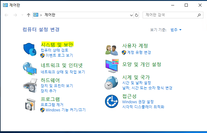 - 제어판 메뉴 중 시스템 및 보안 을 클릭합니다.