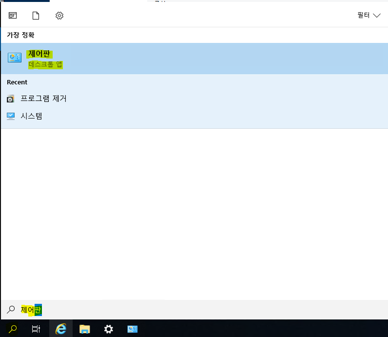 - 윈도우 마크 우측에 있는 검색 버튼을 누른 후 제어판을 검색하고 클릭합니다.