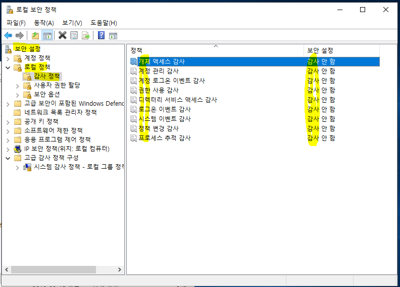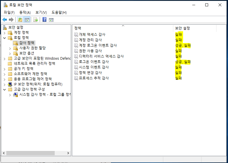 - 보안설정-로컬정책-감사정책을 아래와 같이 설정합니다.