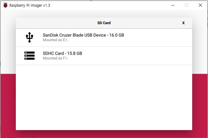 다음은 마이크로 SD카드가 연결되어 있는 드라이브를 선택합니다.