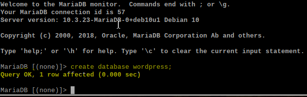 다음은 MariaDB 프롬프트에서 create database wordpress; 쿼리를 입력합니다.