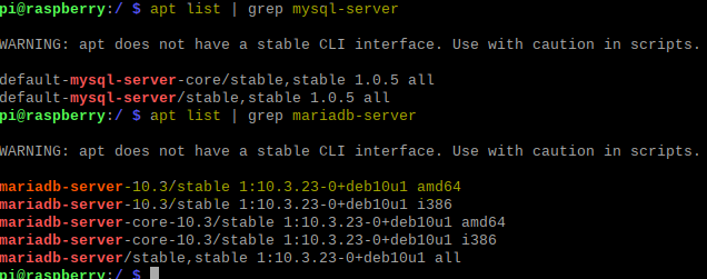라즈베리파이에서 apt 설치 list를 확인해보면 mysql-server는 더이상 존재하지 않고 mariadb-server만 존재합니다.