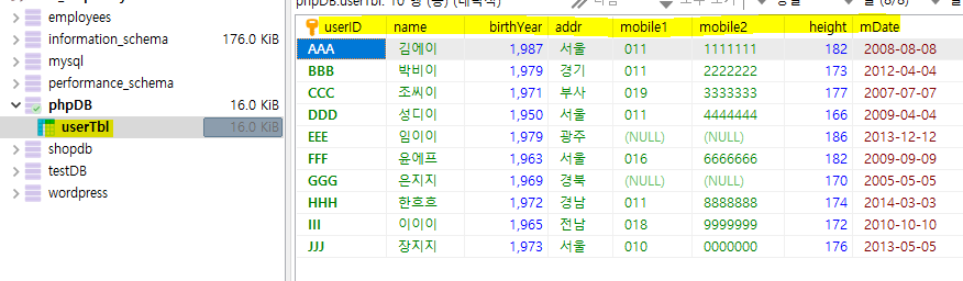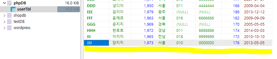 - SQL문 실행: 커넥션변수.query('SQL문장', 콜백함수(에러받는변수, 접속결과받는변수, fields){ 콜백함수 실행내용 });