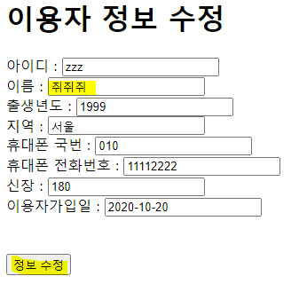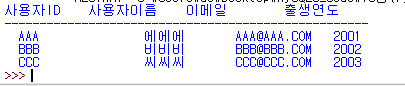 쿼리로 조회된 값을 객체로 받은 result 변수의 값들이 출력됩니다.