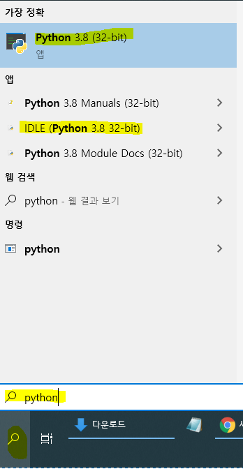 윈도우 아이콘 옆에 돋보기(검색)을 누르고 python을 검색하면 나오는 Python 3.8을 클릭하거나 IDLE 파이썬을 실행합니다.